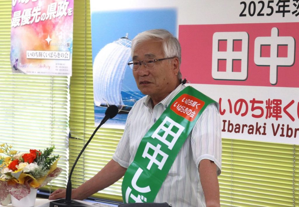 新人の田中氏は水戸駅南の事務所近くで「大企業の儲けより県民の福祉と幸福の実現を」と訴えました。