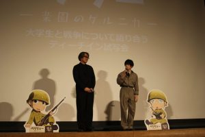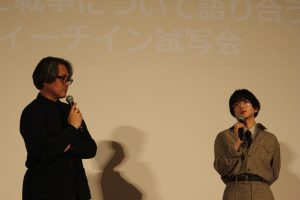 試写会は、ペリリュー島に兵士を送った水戸第二連隊の跡地に戦後開学した茨城大学で行われました。上映後は、主人公の兵士の声を担当した若手俳優の板垣李光人さんと原作者である武田一義さんが登壇し、学生たちと質疑応答を展開しました。