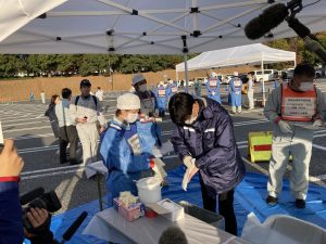 除染の訓練は、手首から手先まで、専用ティッシュを4枚使うなどの入念さでした。今回の訓練では、マイクロバス1台と乗用車5台が使われましたが、実際の過酷事故では検査による渋滞も予想されるため、今後さらに実態に即した訓練が必要になりそうです。