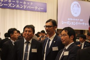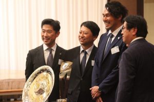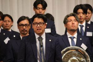 シーズン終了のパーティでは、ホーリーホックの選手や監督が、スポンサー企業やホームタウン推進自治体の支援者らおよそ280人に、入れかわり立ち替わり丁寧に挨拶したほかJ2優勝のシャーレとトロフィの前などで写真撮影に応じたりしました。