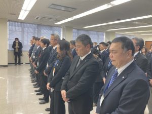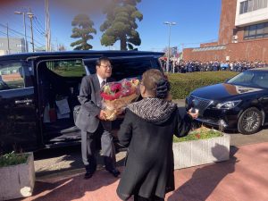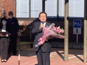 石田氏は玄関前で、市民を前にしたあいさつもしました。そして、大勢の職員に見送られ、退庁しました。