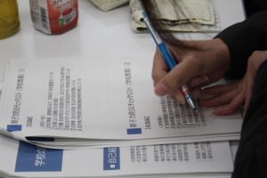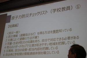 研修会では、原子力の過酷事故を想定し、訓練の仕方や問題点などを話し合うグループワークも行われました。さらに、「事故が起きた際の児童・生徒を引き渡し方」にも話が及びました。