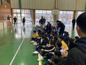 体育の授業による交流では、2つの小学校で混合チームを作り、「しっぽとり」や「追いかけ玉入れ」などを楽しみました。