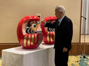一方、関正夫会長は「なくてはならない人物になれるよう努力してほしい」と期待しました。また、関会長はあいさつに先立ち、各地のリモート会場と共に墨でダルマの目を入れ、今年の商売繁盛などを祈念しました。