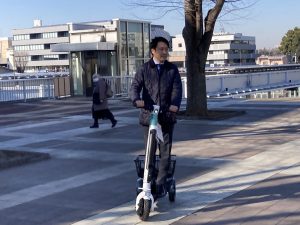 駅前では、市の職員が立ち乗り三輪車「つくモビ」に試乗しながら、説明しました。