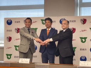 記者会見には茨城県の大井川和彦知事、鹿嶋市の田口伸一市長、鹿島アントラーズの小泉文明社長が出席しました。