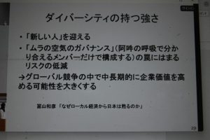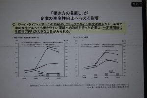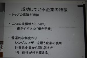 村木さんは、「トップの意識が大事。求められるものは知力・忍耐・説得力と指摘し、「働き甲斐を高めるために仕事が世のため人のためになるか、仕事を通じて苦しさのなかでどう成長できるかが、魅力的な職場である」との考えも示しました。