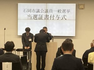 石岡市選挙管理委員会は4月27日、市議会議員選挙の当選証書付与式を開き、当選者に証書を渡しました。