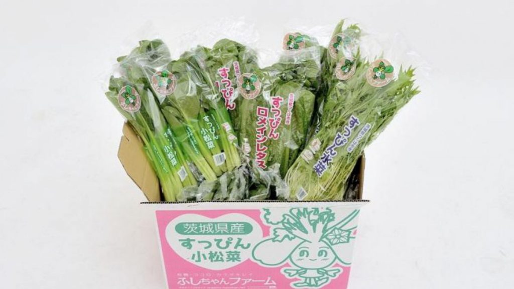 ②すっぴん有機野菜(小松菜、水菜、ほうれん草、リーフレタス)を2セットとふしちゃんファームノベルティグッズ』詰め合わせ